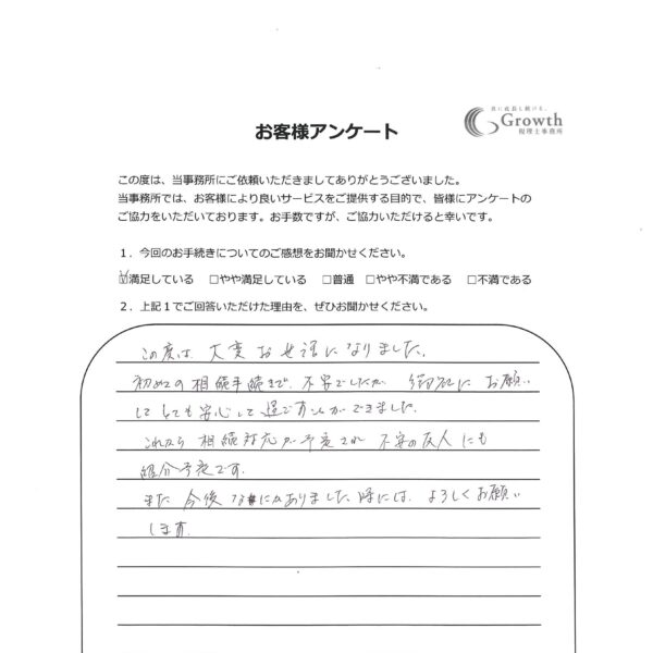 初めての相続手続きで、不安でしたが、御社にお願いしてとても安心して過ごすことができました。