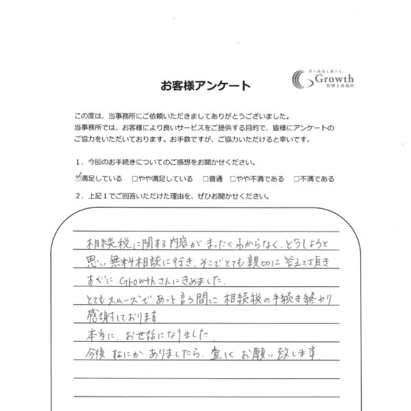とてもスムーズであっと言う間に相続税の手続き終わり感謝しております。